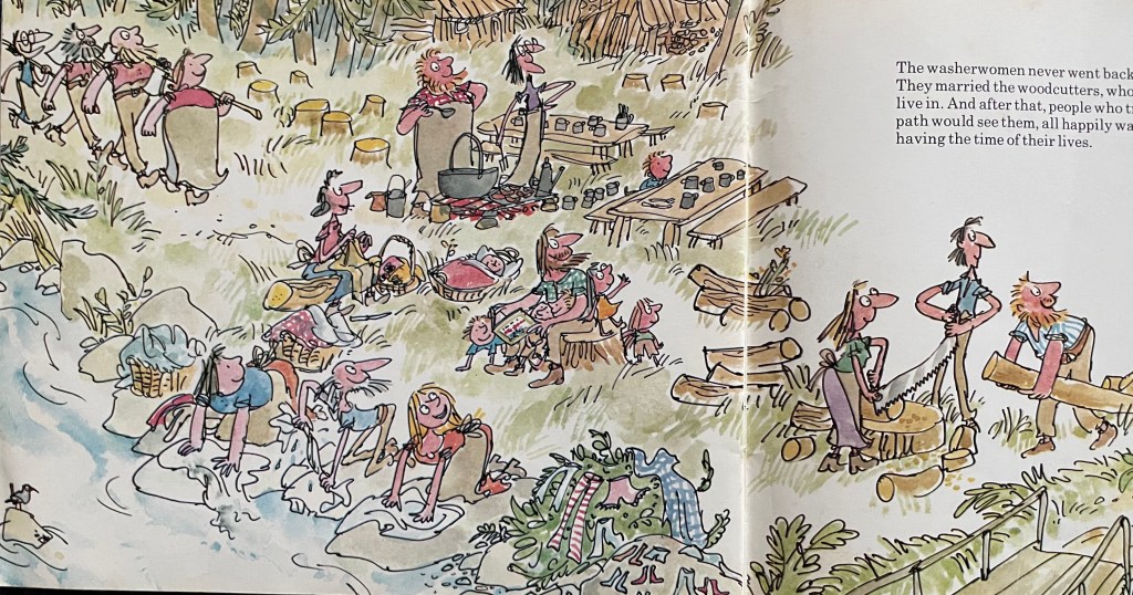 ‘The washerwomen never went back to work for Mr Balthazar Tight. They married the woodcutters, who built them some new log huts to live in. and after that, people who travelled along the mountain path would see them, all happily washing and woodcutting and having the time of their lives.’