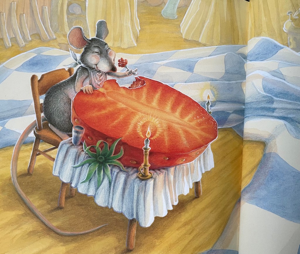 Don Woods’ soft pencil drawings take the reader right into a rodent-scale environment. The lush greens of the abundant garden are both paradise and potential danger to the quivering hero, who retreats to his safe home. An unusual narration technique has the Little Mouse addressed directly by a godlike voice which warns, then guides, and ensures that LM gets what he most wants.