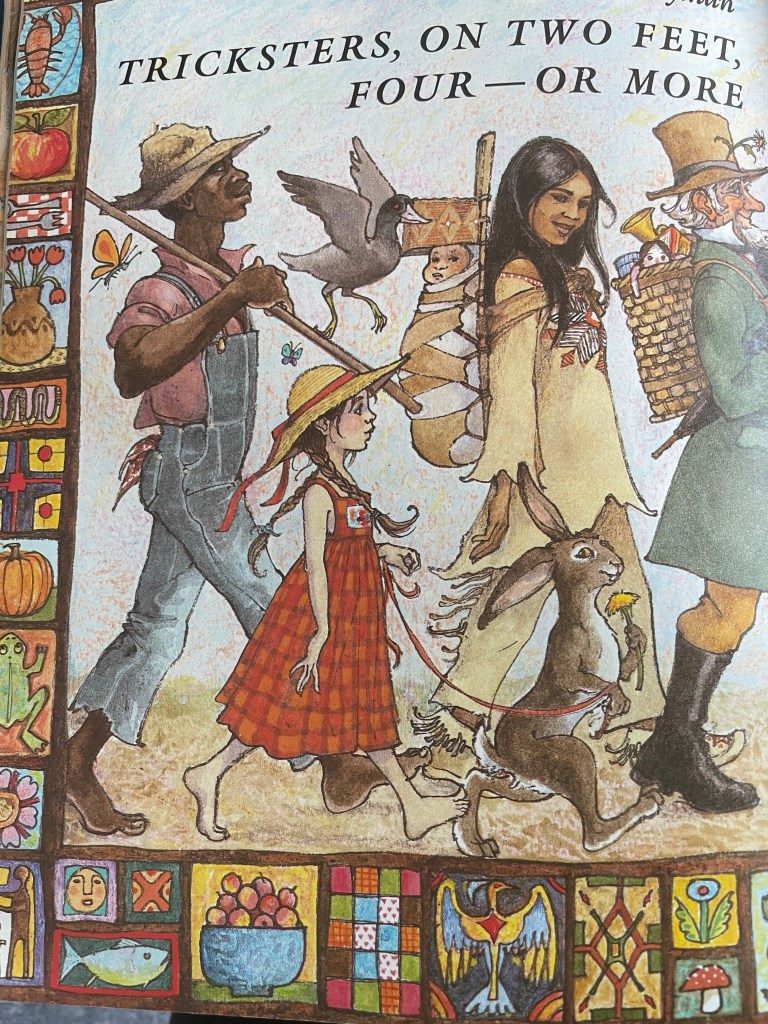 The cropper who drove a hard bargain keeps his hoe at the ready, and his head up. A woman of the Mohican carries the god Wasis on her back while keeping an eye on that scamp Brer Rabbit. He gives the reader the side-eye as he leads (or is led by) Mr Man’s little girl – and is that Uncle Sam hefting a pedlar’s pack? The mud hen who defeated Iktome flies in to join the parade, continued across a double spread in a wonderful invitation to the stories beyond.