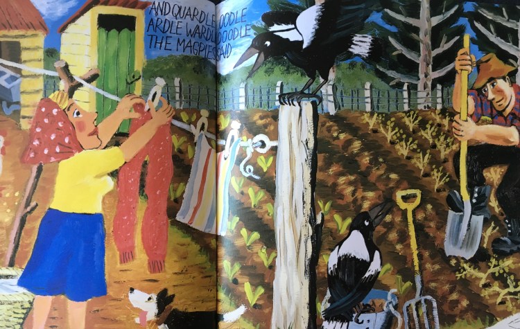 The magpies sing their song in the centre of the doublespread looking at both Elizabeth and Tom. Elizabeth is pinning up Tom’s longjohns, with the essential long-drop in the background. There are no frills in her life: her scarf is not ornament but essential head covering in their cool shaded patch, nevertheless it is red to match her lips. Tom works the soil at the right, doggedly digging out spiny weeds to replace with soft greens. His crooked shovel and the tall and inedible pines behind hint at the futility of this task if the mapgies’ laughing cry isn’t enough. The uncredited book’s designer created half-pages so that their presence and mocking refrain is revealed after each verse.