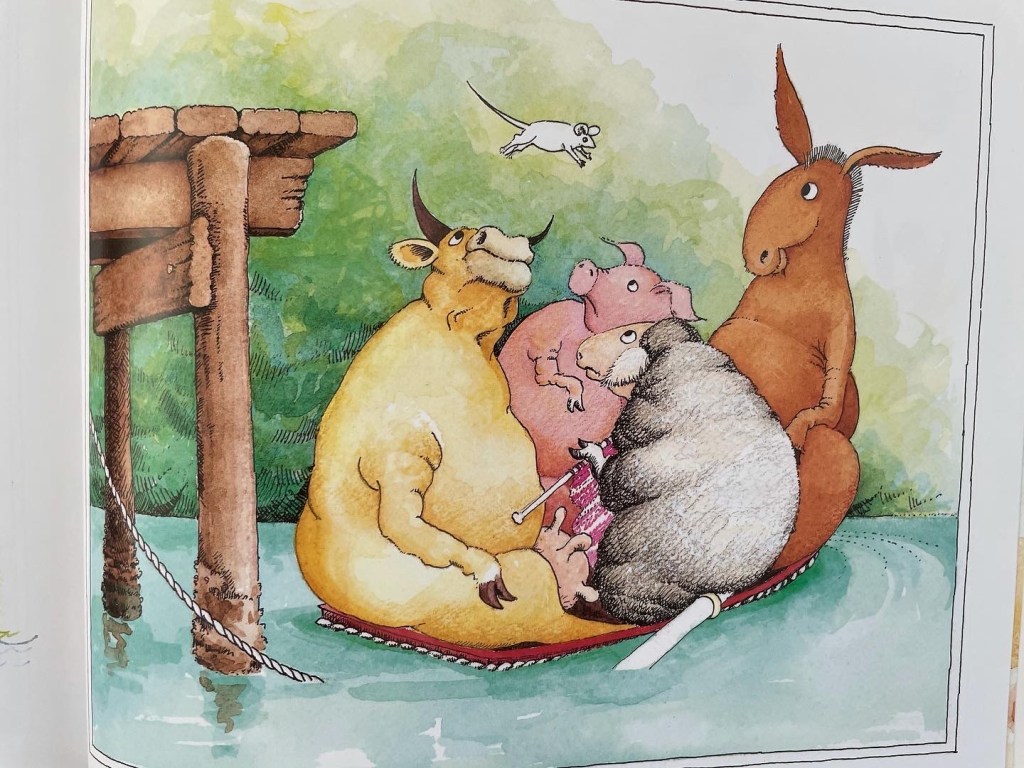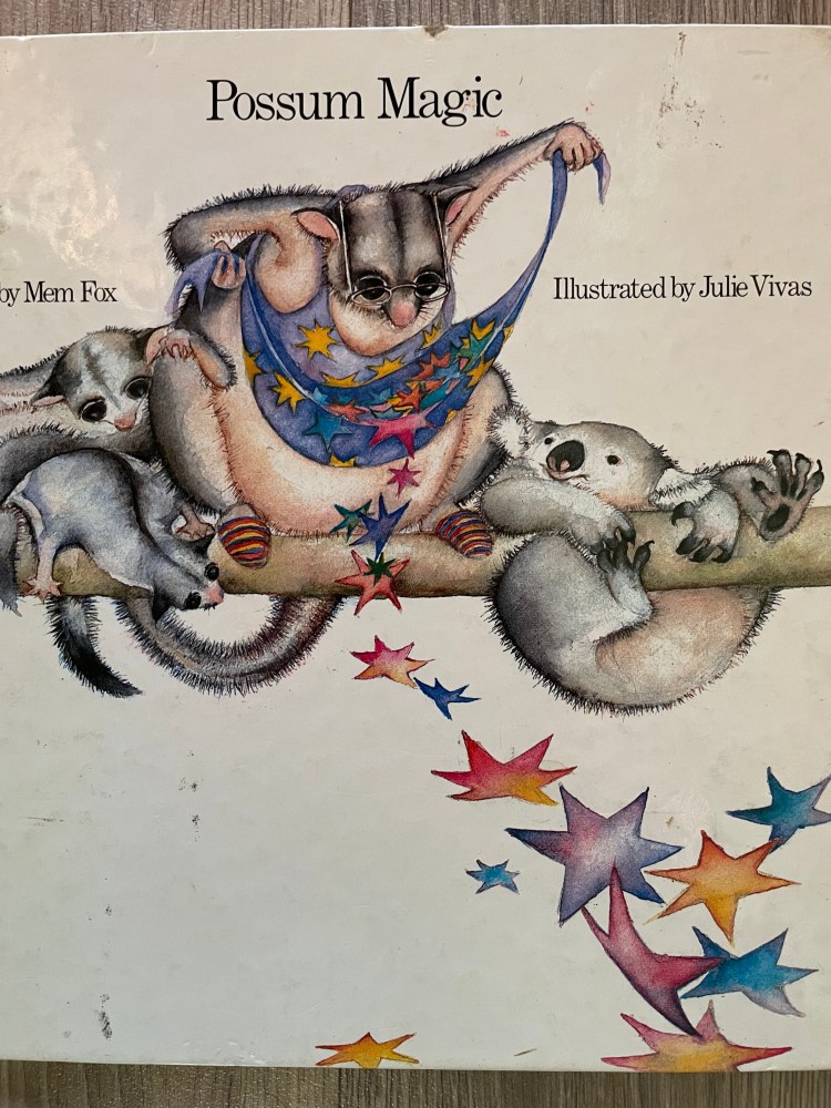 Julie Vivas’s watercoloured scenes and characters exist in white space, anchored by the horizontal lines of branches, verandah rails and a school bench. Grandma Poss performs her bush magic in a star-covered pinny and stripey slippers. Her specs are another signifier of her wisdom, even if she can’t find the spell she needs in her many books (she’s finally discarded them for this final picture.)