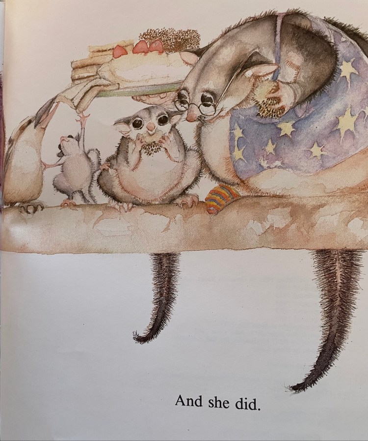 Hush happily makes gooey-eyed contact with the reader as she demolishes half a lamington to ensure her visibility ever after. Many suburban Australians have seen this look before, as a real live possum is surprised with the first fruit of the season in a cherished backyard tree. Grandma holds the plate with the other birthday goodies aloft and the kookaburra levers a vegemite sandwich into gulping position. In between them, a possum joey reaches up. This little unnamed character has hitched a ride from Perth to Tasmania on the last leg to be in on the feast.